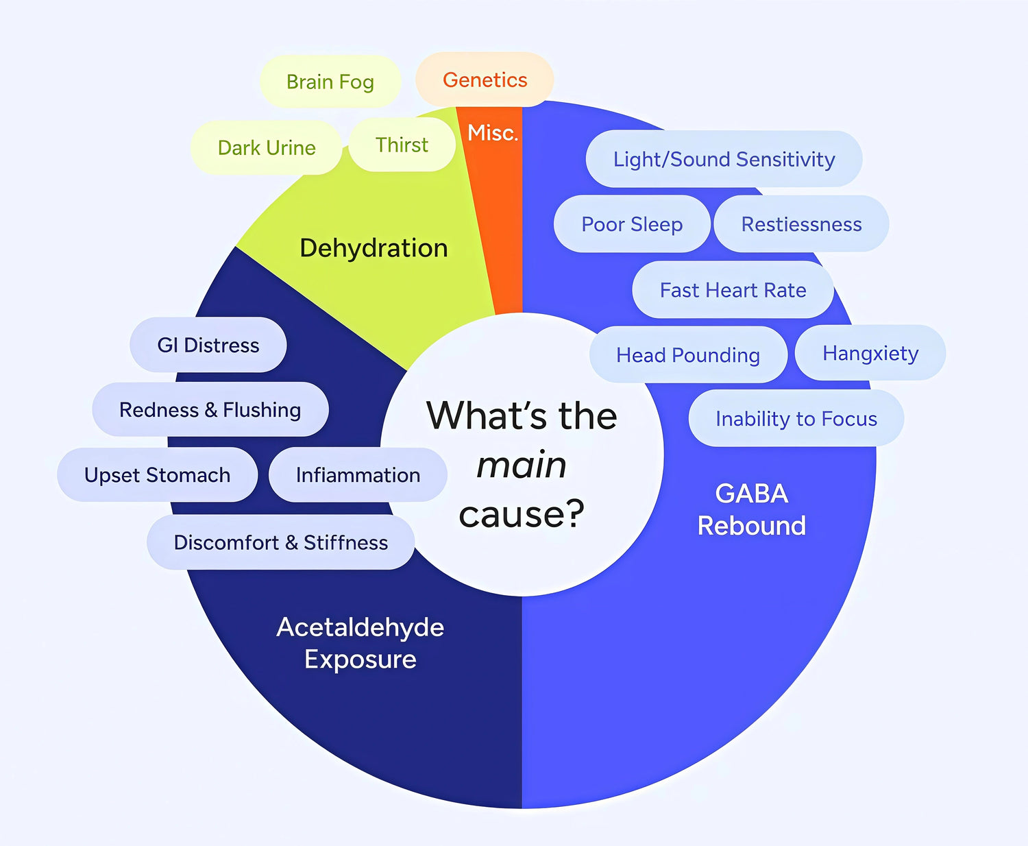 It’s complicated:Alcohol is a multi-faceted compound that has many effects in the body. While dehydration causes some discomfort, it can’t explain ~80% of those next-day effects.